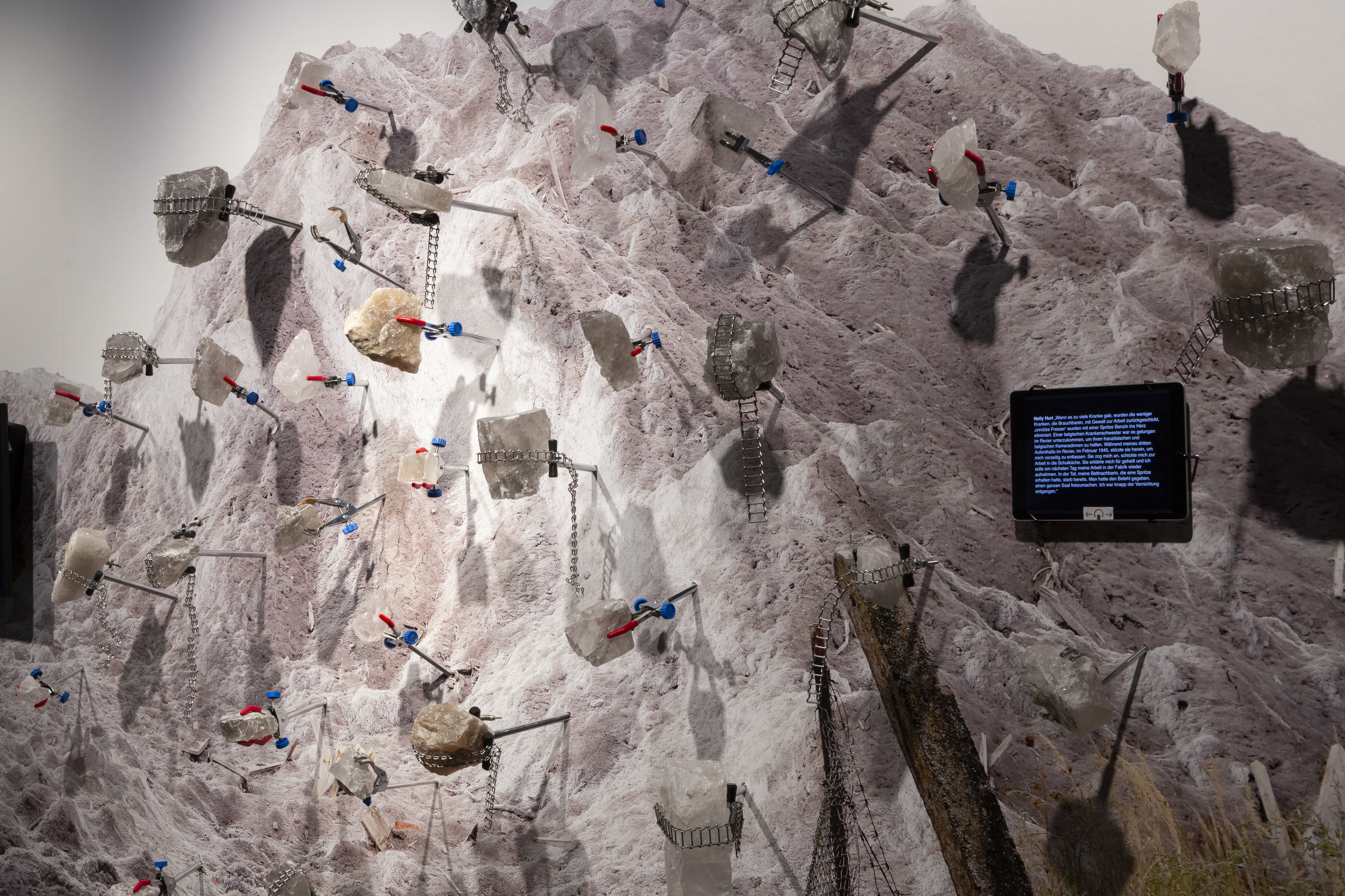 The exhibition SALT. CLAY. ROCK. connects the city of Berlin with rural places in Germany and Hungary that host nuclear infrastructures such as uranium mines, power plants and waste repositories, or have been and still are important sites of anti-nuclear resistance. It presents nine new commissions resulting from the two-year research undertaken by the artists with the curatorial team. Many of the works were created in dialogue with local communities, foregrounding their subjective and grassroots perspectives. This shows how those directly impacted by the day-to-day reality of nuclear infrastructures, coexist with its consequences, as well as its looming yet invisible dangers.